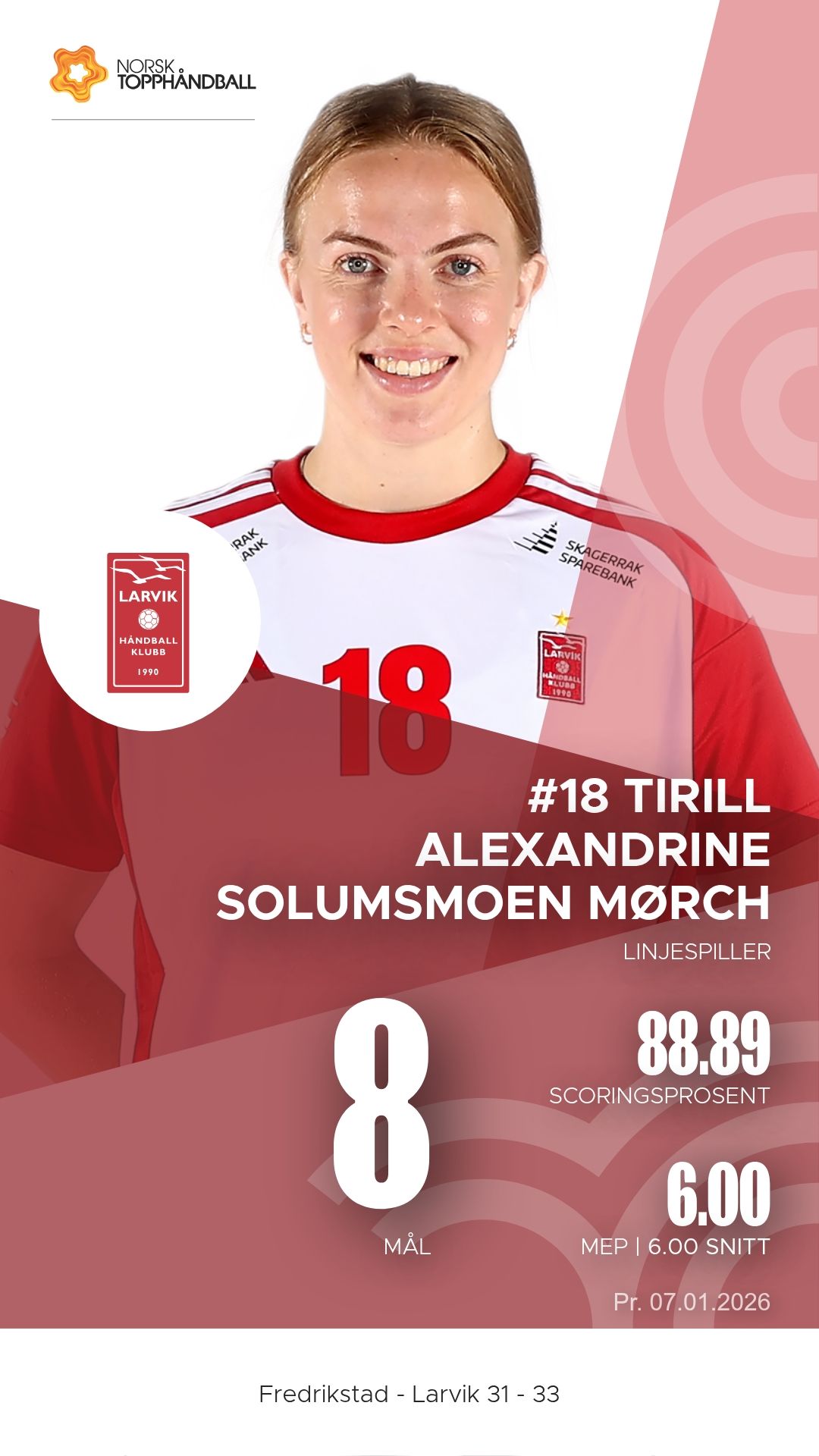 Larviks Tirill Alexandrine Solumsmoen Mørch ble kampens mest effektive spiller med åtte mål og flere avgjørende bidrag fra linjespillerposisjon. Hun ble kåret til kampens beste spiller. Maja Furu Sæteren imponerte med sitt gjennombruddsspill og fem målgivende pasninger. Frøydis Wiik Seierstad leverte også en sterk kamp med fire mål og godt overblikk i Larviks bakspillerrekke.