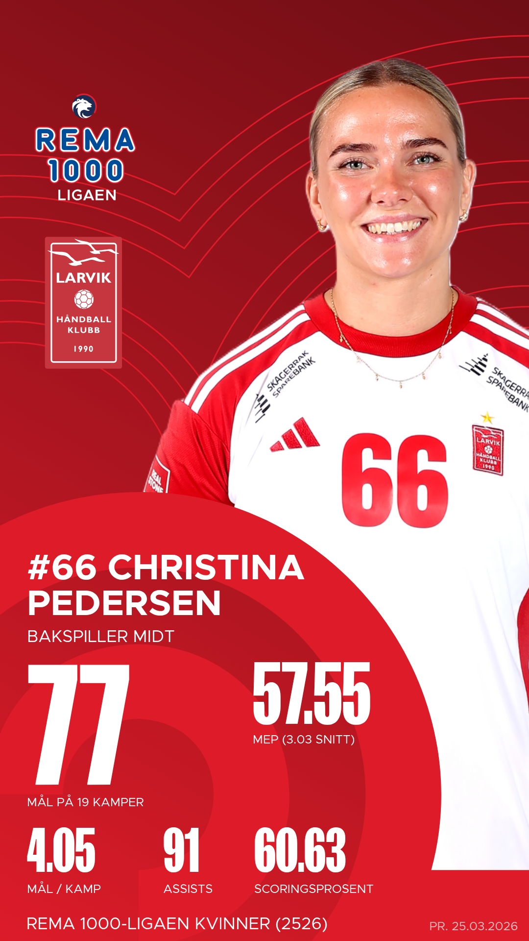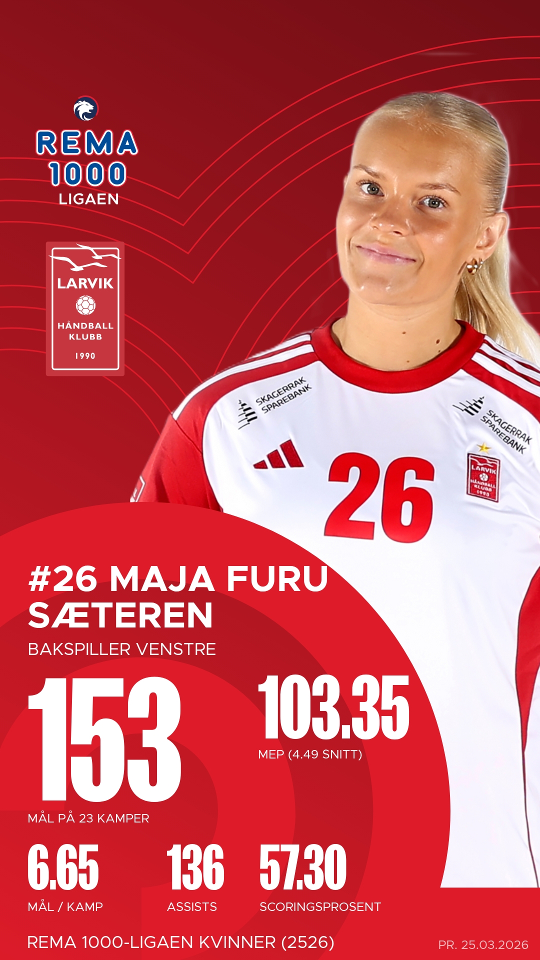 Larvik stiller med en rekke profiler som har levert på høyt nivå gjennom sesongen. Maja Furu Sæteren har vært lagets motor og toppscorer, med et imponerende antall mål og assists. Hun har vært en konstant trussel fra bakspillerposisjon og er lagets mest effektive spiller. Christina Pedersen er playmakeren som styrer angrepsspillet med kløkt og presisjon, og hennes evne til å finne linjespillerne med perfekte innspill har vært avgjørende i mange kamper. På kanten har Guro Ramberg vært et uromoment for alle motstandere – rask, presis og med et dødelig effektivt avslutningsregister.
